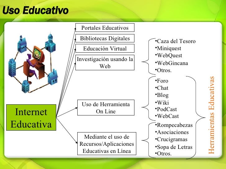 Correo electrónico, Chat, mensajería, foros, audio y videoconferencias, redes sociales, wikis, WebQuest, podcats, aulas virtuales, bibliotecas, libros, enciclopedias, diccionarios, traductores, convertidores, museos, instituciones educativas, capacitaciones, actualizaciones, cursos, asignaturas, carreras profesionales, post grados y especializaciones en línea en línea, etc.